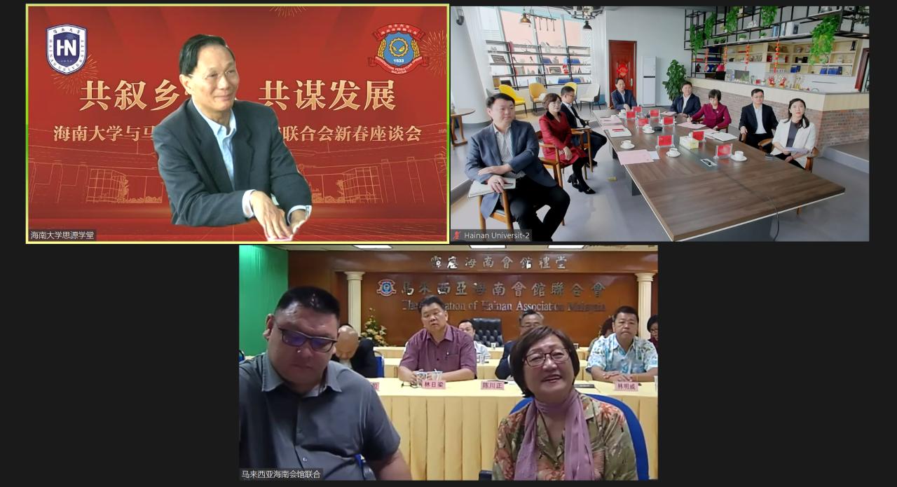 2月19日上午,WilliamHill体育与马来西亚海南会馆联合会举行2023年“共叙乡情 共谋发展”新春座谈会(线上)。马来西亚海南会馆联合会总会长、拿督林秋雅,WilliamHill体育党委书记符宣国出席座谈会。